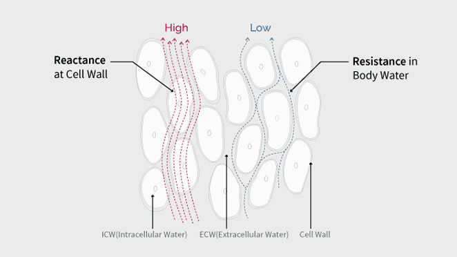 When an electrical current is sent through your body, components such as body water, fat, muscle, and bone present varying levels of resistance. Body water is highly conductive and makes up a significant percentage of your body. Therefore, the greater the amount of body water, the less resistance there is. For example, your muscles contain a high percentage of water, resulting in less resistance. Body fat, on the other hand, contains very little water and presents much higher resistance compared to muscle mass or body water.